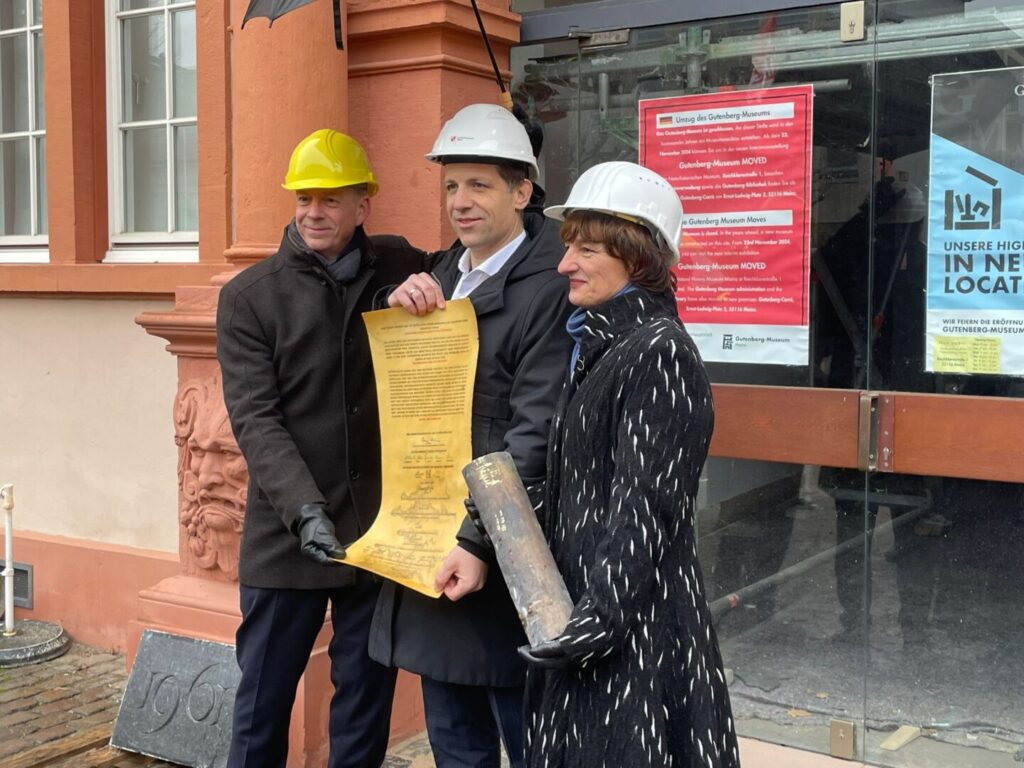 Grundsteinfreilegung auf der Baustelle des Gutenberg-Museums