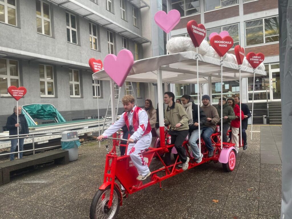 Zum Dritten mal rollt beim Rosenmontagszug der Interaktive Fastnachtswagen der Mainzer Hochschule über die Straßen. In dem Projekt sind Studentinnen und Studenten aus allen drei Fachbereichen der Hochschule zusammengekommen. Dadurch sollten verschiedene Sichtweisen entstehen. Mit dabei sind Studierende der Architektur, die eher in eine praktische Richtung denken sowie Wirtschaftsstudierende, die eher die technische und wirtschaftliche Seite sehen, so Paul Krüger, Student der Hochschule Mainz.