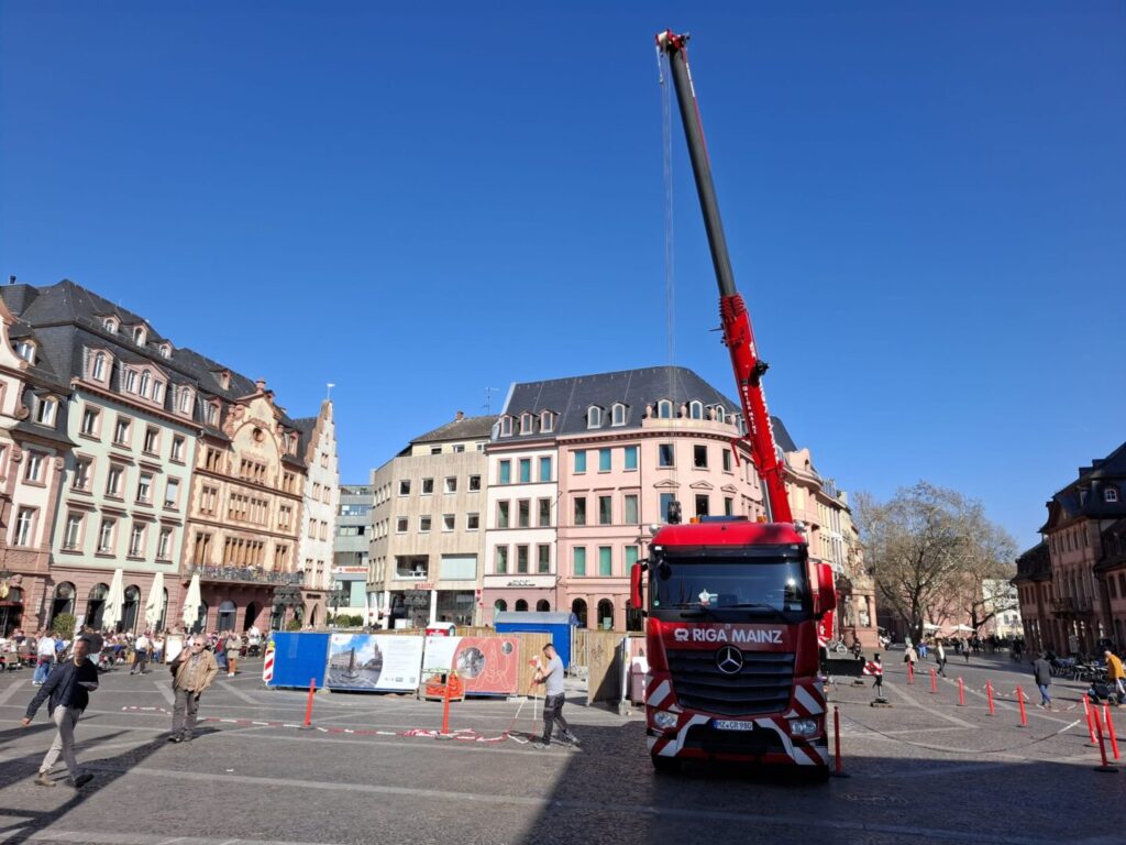 Der Markt vor dem Mainzer Dom zeigt sich ab sofort ohne das Wahrzeichen der Heunensäule. Mit zwei Kränen wurde die…